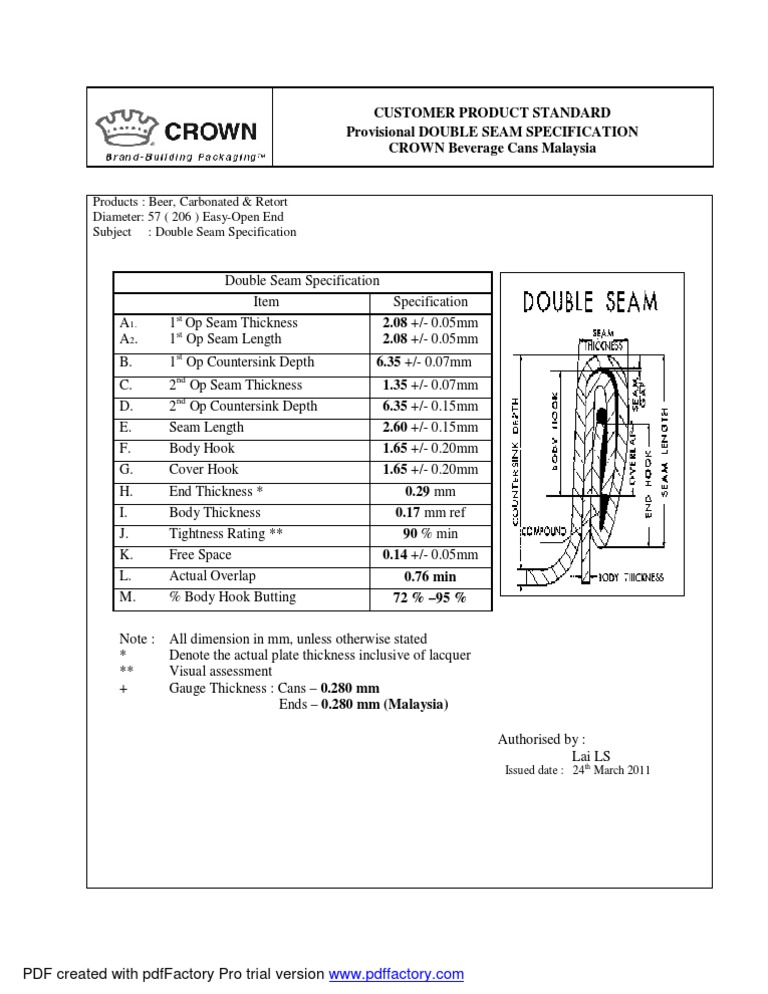 W = neck seaming clearance. This subreddit is for the discussion of all things related to the industry such as business plans, marketing, startup, licensing, distribution, and technical issues. From soda can design to energy drink manufacturing, crown produces a comprehensive range of aluminum and tinplate cans to match various beverage applications, drinking occasions and distribution channels. Top auswahl an toyota crown neu & gebraucht. Sc 5200 series specifications * optional masts, attachments, longer load dimensions and higher lifting heights may result in derating of the capacity. Specs of ball and crown cans i'm looking for the documentation of ball vs crown cans to make sure i can switch between the 2 in the next couple of months. Body outside diameter* 2.602 ±.007: Sanitary can dimensions, can flanging specifications. Can manufacturers provide seam specifications for their cans and lids. Physically tearing down a seam is a risky procedure that can cause injuries and long term harm (carpal tunnel syndrome). Once the seam is qualified as meeting the standard stipulated in the seam specification and the line has entered production, the seams should be assessed as. The seam quality produced by the can seamer is greatly dependant on the quality of the cans & ends used. The seam should initially be set to a five can per head seam check, and should meet the target dimensions outlined on a seamer specific specification provided by the can & end supplier.